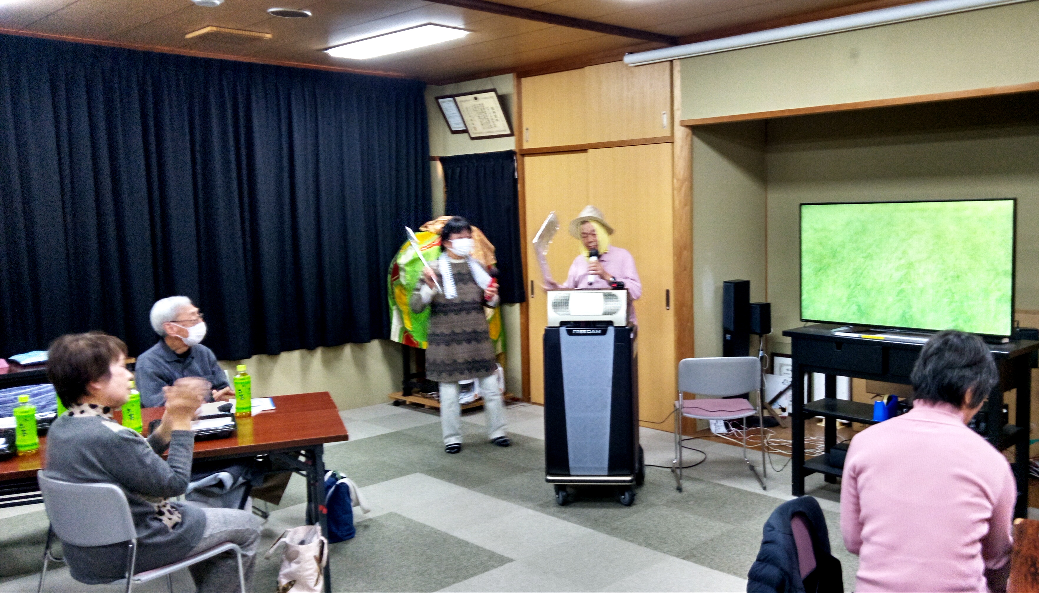 11月21日(金) 朝倉台盛春クラブカラオケ愛好会合同発表会 カラオケ愛好会は、11月21日(金)午後集会所2階で合同発表会を開催しました。 同愛好会は毎月第3金曜日、昼組(会員11名)・夜組(15名)の二部に分かれてカラオケを楽しんでいます。 今回、下半期のまとめとして各会員が得意の持ち歌をそれぞれ2曲披露しました。 農夫,農婦に扮した2人が「麦畑」を熱唱、発表会を大いに盛り上げるなど楽しいひと時を過ごすことが出来ました。参加者20名 トップページに戻る